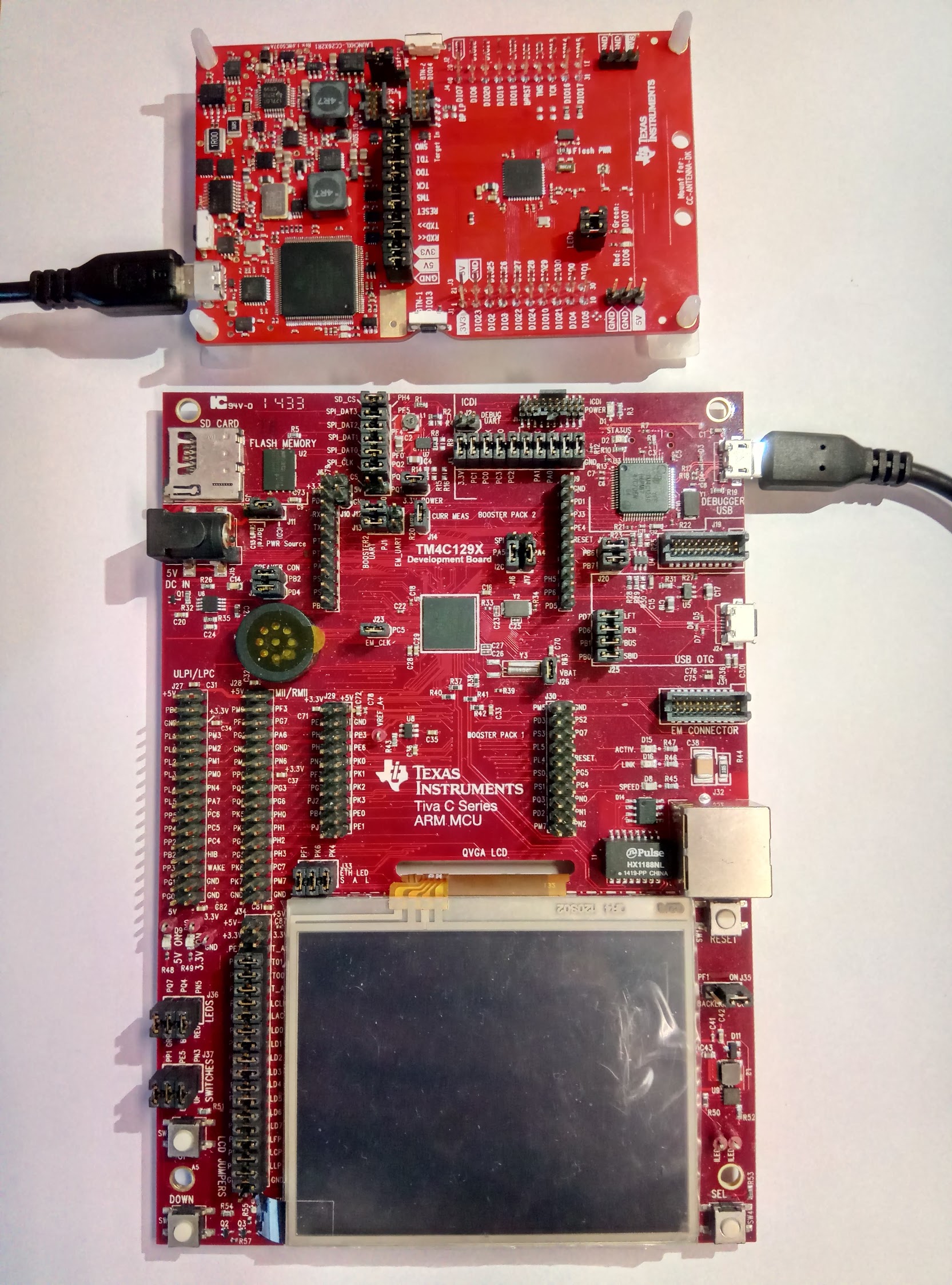 Para perceber o consumo energético e o tempo de processamento associado a um determinado modo de codificação de áudio (presente no tele-comando) é necessário variar estes modos monitorizando as grandezas anteriormente mencionadas. Para esta monitorização foi já implementado o codificador Opus nas placas de desenvolvimento CC1642R1 e TM4C129x, apresentadas na figura abaixo respetivamente: